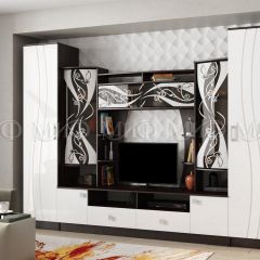 Яркое решение для гостиной. Стеклянные дверцы верхних фасадов за счет их декорирования матовым рисунком, выглядят стильно и практично. Хорошая возможность создать уникальный интерьер