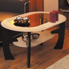 Современный журнальный столик "Маджеста-2", привлекающий внимание неординарным дизайном, оригинальным сочетанием оттенков и красивой вставкой из тонированного стекла. Его тёмные фигурные ножки красиво сочетаются со светлой полочкой и столешницей, образуя единую композицию. Столик не отличается большими габаритами, но при этом на его столешнице и полке можно разместить немало книг, газет, журналов и других предметов.