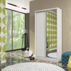 Внутреннее наполнение шкафа включает удобные полки и два выдвижных ящика с одной стороны, а также вместительную платяную секцию с надёжной металлической штангой для одежных вешалок за другой створкой. Нижнеопорная система раздвижных створок обеспечивает лёгкое и ровное открытие.